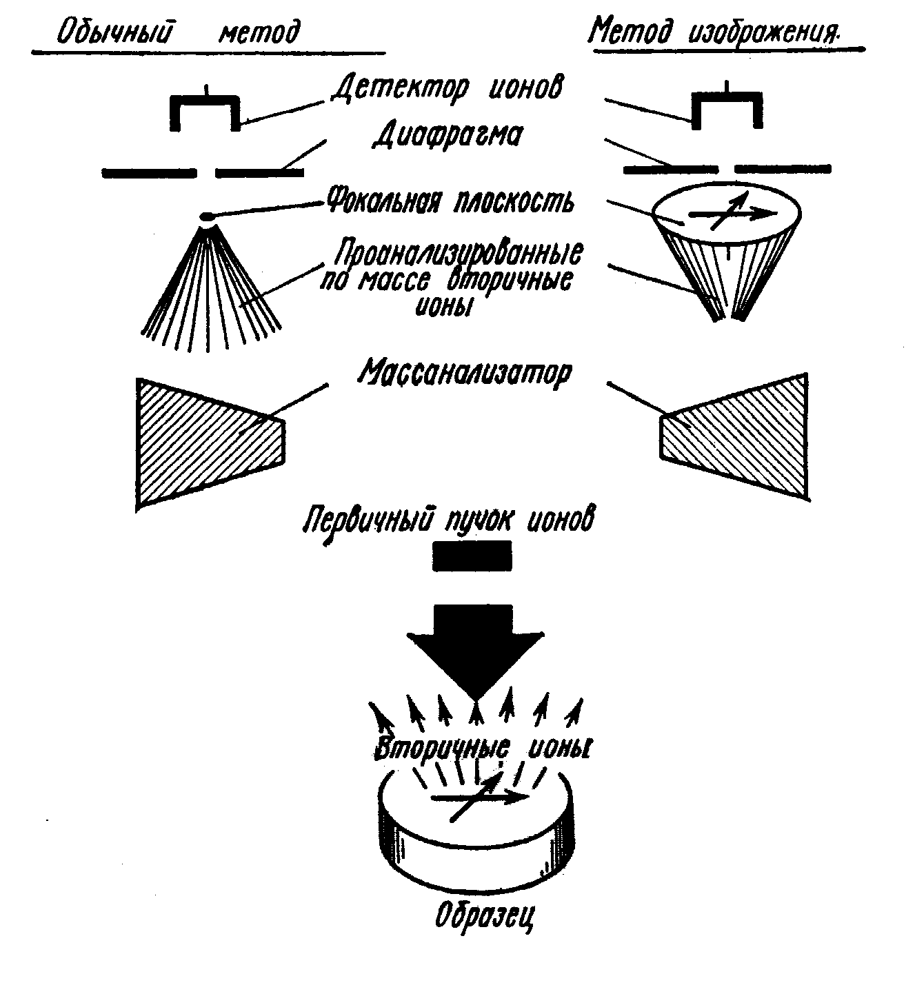 Вторично-ионное изображение, дающее двумерную картину размещения элемента по поверхности, может быть получено либо методом масс-спектрального микроскопа, либо методом сканирующего микрозонда. В масс-спектральных микроскопах разрешение по поверхности не зависит от размеров первичного ионного пучка; оно определяется аберрациями оптики анализатора вторичных ионов и хроматическими аберрациями, обусловленными разбросом вторичных ионов по энергиям. Если улучшать разрешение введением фильтра энергий, то снижается “светосила” прибора (число регистрируемых вторичных ионов, приходящихся на одну первичную частицу). В масс-спектралъных микроскопах достигнуто поверхностное разрешение ~1 мкм.