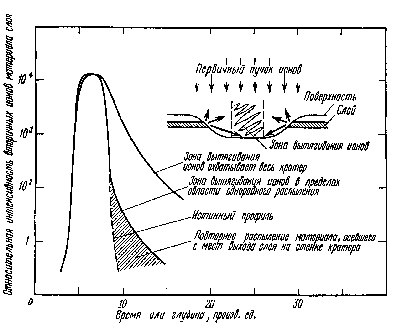 Получить при методе ВИМС надежные сведения о глубинном профиле можно лишь в том случае, если поддерживается постоянная интенсивность тока первичных ионов и обеспечивается однородность плотности тока пучка в той части поверхности, из которой в масс-анализатор отбираются вторичные частицы. В стационарном сфокусированном ионном пучке плотность тока, падающего на образец, не постоянна по сечению пучка, а следовательно, и распыление поверхности в этих условиях не может быть равномерным. Если зона, из которой поступает информация, охватывает все сечение первичного пучка, то вклад в сигнал ионов с краев кратера будет искажать профиль концентрации элемента в приповерхностном слое (фиг. 13).