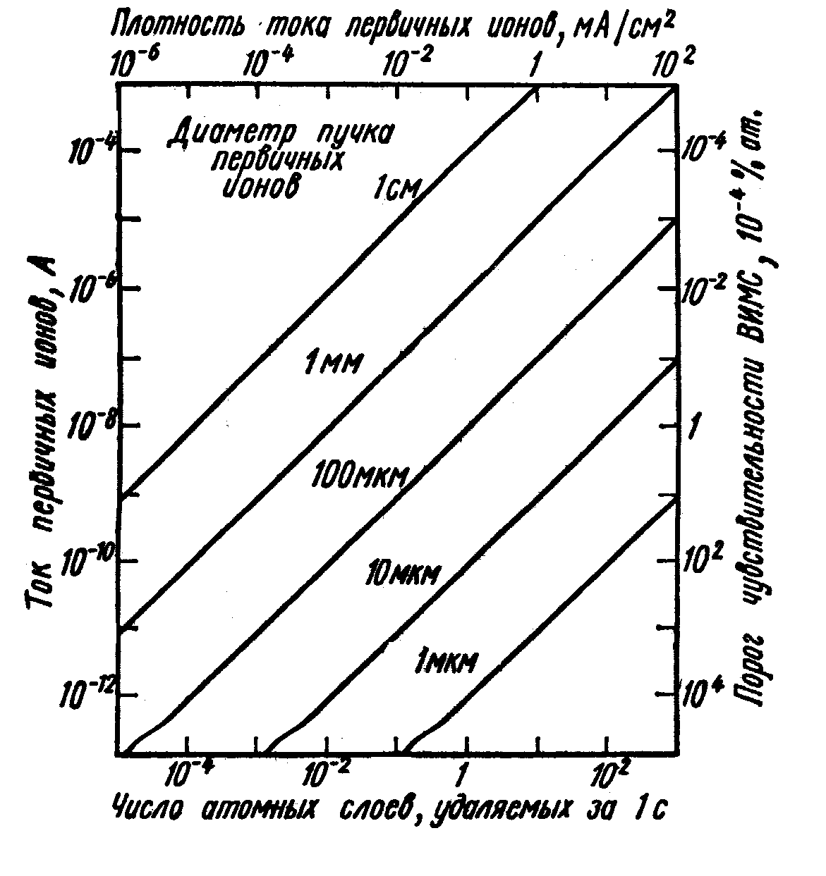 пучка, скоростью удаления атомных слоев и порогом чувствительности ВИМС[1].