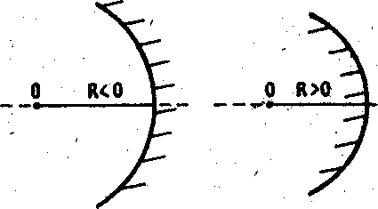 Для выпуклой линзы R1 и R2 > 0. Тогда, если n > 1, то D > 0, т. е. линза собирающая, если же n < 1, то D < 0, линза рассеивающая, где n = n>л>/ncp — отношение показателей преломления линзы и среды. Радиус кривизна считается положительным для выпуклых поверхностей и отрицательным для вогнутых (рис. 5.). Для двояковогнутой линзы R1 и R2< 0. Тогда, если n > 1, то D < О, т. е. линза рассеивающая, если n< 1, то D > 0, и линза собирающая.