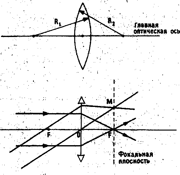 называется прямая, проходящая через центры сферических поверхностей, ограничивающих линзу. Радиусы этик сфер называются радиусами кривизны, Фокусом линзы называется точка пересечения F преломленных линзой лучей, падающих параллельно равной оптической оси. Плоcкость, проходящая через фокус перпендикулярно главной оптической оси, называется фокальной плоскостью. Оптическим центром линзы называется точка, при прохождении через которую любой луч преломляется таким образом, что направление его распространения не изменяется. Оптический центр — это точка пересечения главной оптической оси с тонкой линзой. Другие прямые, проходящие через