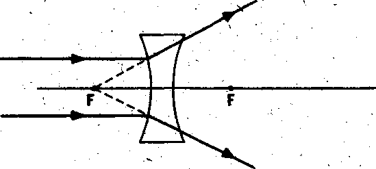 У рассеивающей линзы фокус мнимый. Параллельный пучок лучей, падающих на линзу, рассеивается. Пересекаются продолжения этих лучей (рис. 4).