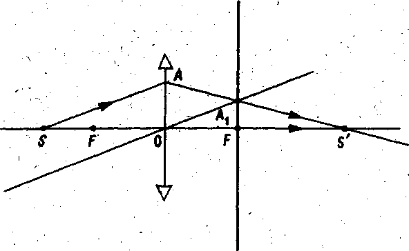Пусть источник находится в некоторой произвольной точке S (рис 6,б ). Возьмем два луча: луч S0 проходит, не преломляясь, через оптический центр линзы, луч SA параллелен главной оптической оси. После преломления в линзе этот луч проходит через фокус линзы. Точка пересечения лучей S' - действительное изображение источника S.
