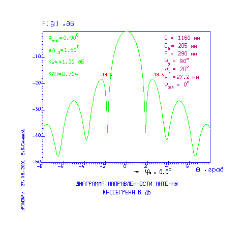 Рассчитанная диаграмма направленности всей антенны по схеме Кассегрена вместе с параметрами изображена в приложении 3.