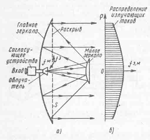 Двухзеркальня антенна по схеме Кассегрена представляет собой систему состоящую из двух отражающих поверхностей – софокусных параболоида и гиперболоида – и облучателя, установленного во втором фокусе гиперболоида. Все расстояния по ломанной линии от фокуса до раскрыва одинаковы, что обеспечивает синфазность поля в раскрыве. Двухзеркальная антенна является более компактной, чем однозеркальная, и обеспечивает более равномерное распределение возбуждения по раскрыву, а также является более помехозащищённой, даёт возможность укоротить тракт СВЧ, и разместить основную часть конструкции облучателя за зеркалом, что особенно удобно в моноимпульсных радиолокаторах. При оптимизации размеров облучателя и малого зеркала удаётся получить КИП (0,600,65). Недостаток системы – затенение раскрыва малым её зеркалом, а также обратная реакция малого зеркала на облучатель.