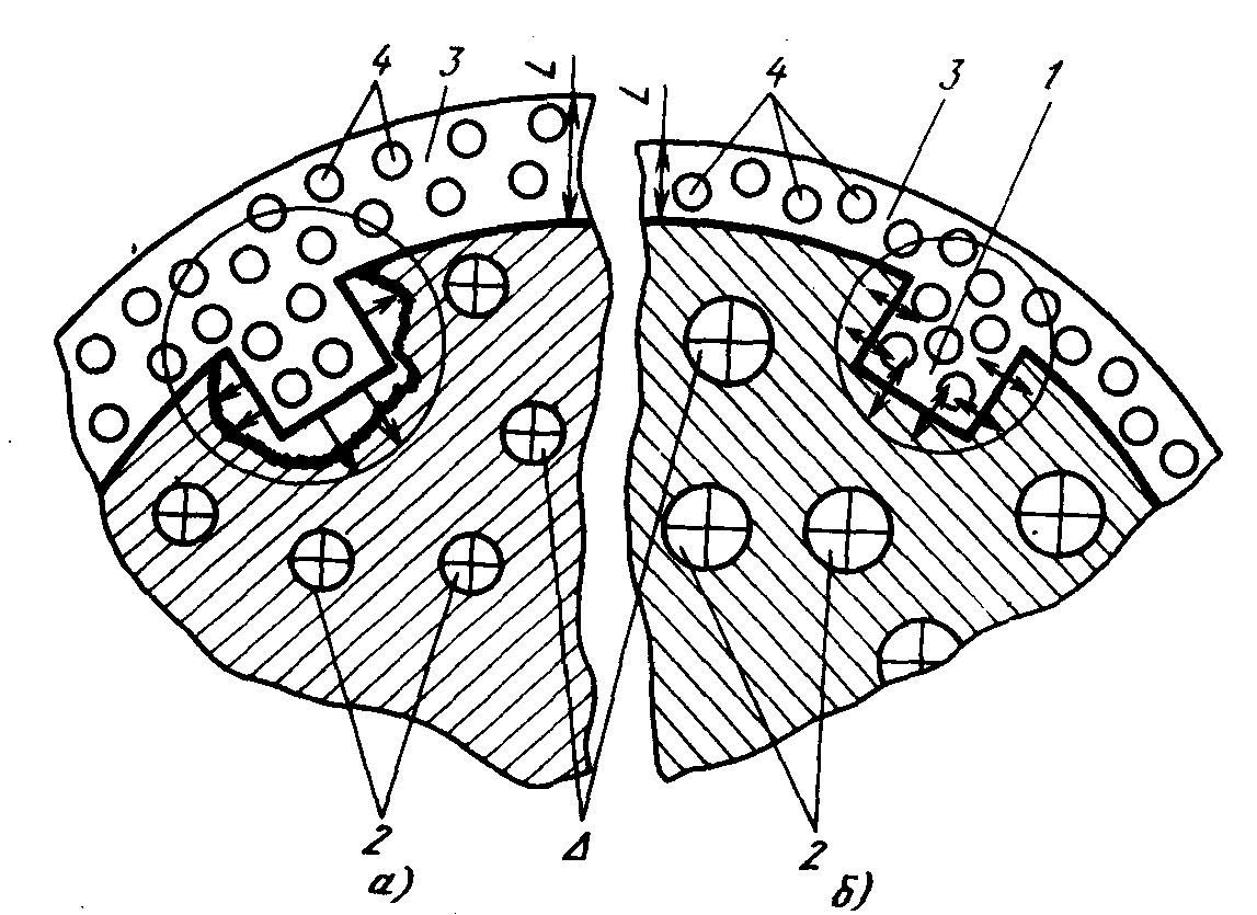 .1 - микротрещины, заполненные намагниченными частичками и скоагулированными продуктами износа детали; 2 - "тепловые трубки", определяющие скорость охлаждения детали (поле скорости охлаждения); 3 — область активного смазывания детали в узле трения скольжения; L — толщина слоя смазывания; 4 - тонкодисперсные скоагулированные магнитным полем продукты износа деталей