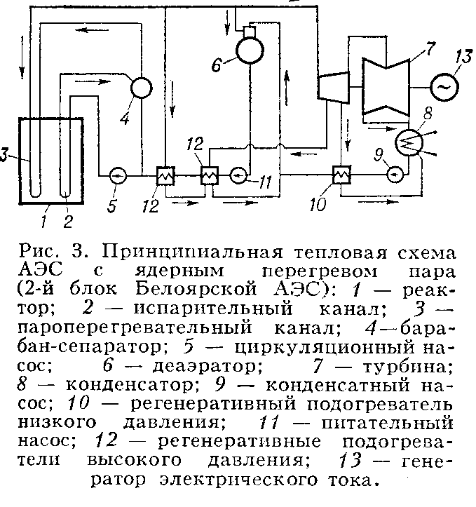 Принципиальная схема АЭС с ядерным реактором, имеющим водяное охлаждение, приведена на рис. 2. Тепло, выделяется в активной зоне реактора, теплоносителем вбирается водой (теплоносителем) 1-г контура, которая прокачивается через реактор циркуляционным насосом г Нагретая вода из реактора поступав в теплообменник (парогенератор) 3, где передаёт тепло, полученное в реакторе воде 2-го контура. Вода 2-го контура испаряется в парогенераторе, и образуется пар поступает в турбину 4.