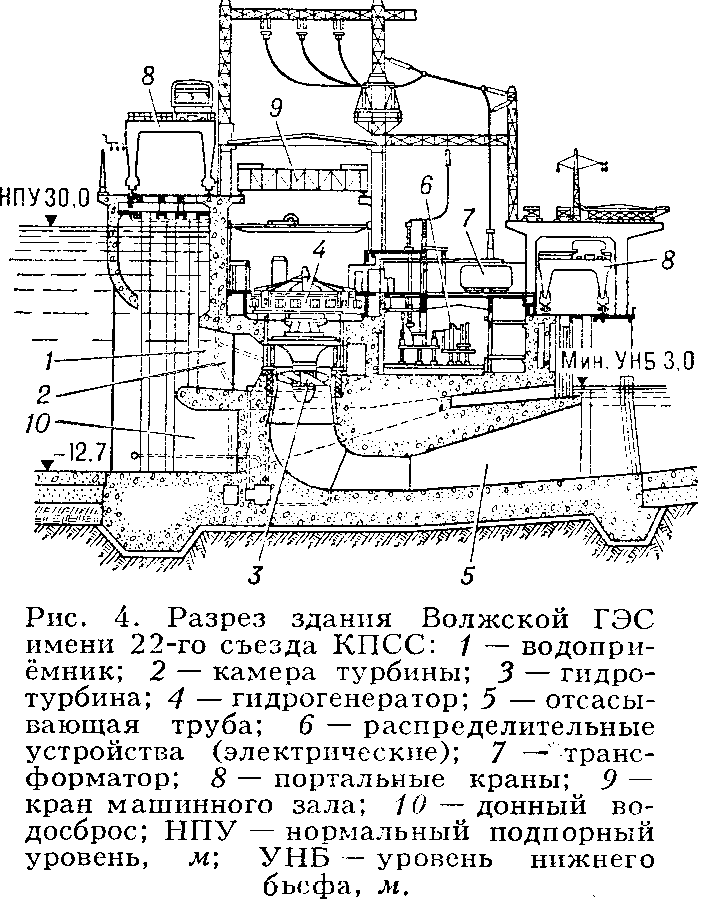 меру, гидротурбину, отсасывающую трубу, а по спец. водоводам между соседними турбинными камерами производится сброс паводковых расходов реки. Для русловых ГЭС характерны напоры до 30—40 м к простейшим русловым ГЭС относятся также ранее строившиеся сельские ГЭС небольшой мощности. На крупных равнинных реках основное русло перекрывается земляной плотиной, к которой примыкает бетонная водосливная плотина и сооружается здание ГЭС. Такая компоновка типична для многих отечественных ГЭС на больших равнинных реках. Волжская ГЭС им. 22-го съезда КПСС— наиболее крупная среди станций руслового типа.