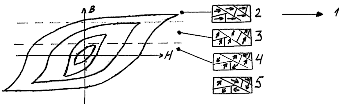 Рис.1 Стадии цикла намагничивания ( Формы петель гистерезиса при различных напряженностях максимального поля). Справа показаны границы доменов и направление векторов их спонтанного намагничивания в том же месте образца в различных стадиях намагничивания.
