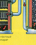 Прежде чем смесь SO>2> и O>2> попадёт в контактный аппарат, её необходимо нагреть до температуры 400-500°С. Нагрев смеси начинается в теплообменнике, который установлен перед контактным аппаратом. Смесь проходит между трубками теплообменника и нагревается от этих трубок. Внутри трубок проходит горячий SO>3> из контактного аппарата. Попадая в контактный аппарат смесь SO>2> и О>2> продолжает нагреваться до нужной температуры, проходя между трубками в контактном аппарате.