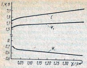 График зависимости ЭДС и потенциалов электродов от плотности электролита: