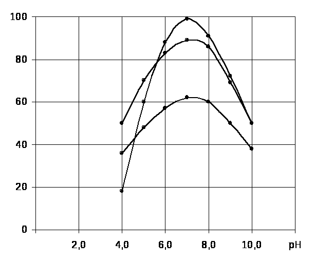 К наиболее важным характеристикам ферментных препаратов, которые определяют возможность их применения на практике, относят рН, температурный оптимум, субстратную специфичность. Кривые строятся на основе данных, полученных при измерении скоростей реакции, протекающей в буферных растворах с разными значениями рН.