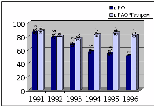 Надо отметить, что в 90-е годы решение крупных народохозяйственных задач газовой отрасли происходило на фоне снижения уровня их финансирования. Динамика объемов НИОКР могла бы свидетельствовать о стабилизации финансирования научных исследований в отрасли, хотя и на меньшем, чем в 90-м году уровне (на 25-30%), если бы из-за неплатежей за газ не происходили длительные (до одного года – двух лет) задержки оплаты выполненных работ. Сопоставление уровней среднемесячной зарплаты научных работников в РФ и РАО "Газпром" - также не в пользу научных работников отрасли. Кроме того, очевиден и более низкий уровень их зарплаты по сравнению со средней в отрасли (66,6-34,3 %}. Тем не менее принятые руководством Общества меры по индексации зарплаты и введению доплат за ученые степени способствовали, начиная с 1994 г.. стабилизации научных коллективов. Негативно можно оценить лишь снижение доли работающие СВК в общей численности исследователей (рис. 1),