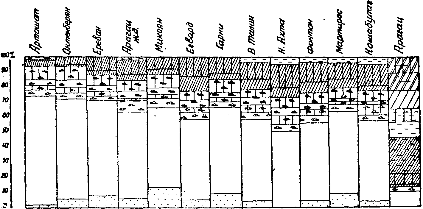 В предгорную часть Араратской долины, в пределах Армении, входят южные склоны массива Арагац до высоты 1600 м, Егвардское и Канакерское плато, западные склоны и предгорная часть бассейна реки Арпа до 1600 м. Предгорные степи формировались как из вулканических лав, так и крупными наносами левых притоков реки Араке. В склонах предгорий очень часто встречаются каменные осыпи и аллювиальные глыбовые россыпи, образованные вследствие сильного действия механического выветривания. Реки в предгорной зоне протекают быстро и образовали каньоны глубиной 50—60 и более метров, с крутыми склонами. На сравнительно низких отметках — серые и бурые почвы, иногда перемежающиеся с солонцеватыми и солончаковатыми почвами, но преобладающими в этом районе являются каштановые почвы, на верхней границе переходящие в черноземы. Почвы эти покрыты разнотравной степной растительностью. Средние высоты склонов гор до высоты 2500—2700 м сложены в основном вулканическими лавами, на которых формировались горные черноземы с разнотравной и луговой растительностью. В непосредственно переходной зоне залегают горно-дерново-луговые почвы с альпийской растительностью. В вершинной зоне выступают каменные скалы, глыбы, полосы с только образующимся бедным почвенным покровом и скудной растительностью.