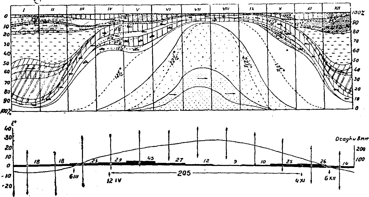 Как видно из таблицы, на разных глубинах почвы температура подвержена значительным изменениям. Надо отметить, что суточные колебания температуры почвы летом затухают на глубине 80 см, а зимою на глубине 40 см.