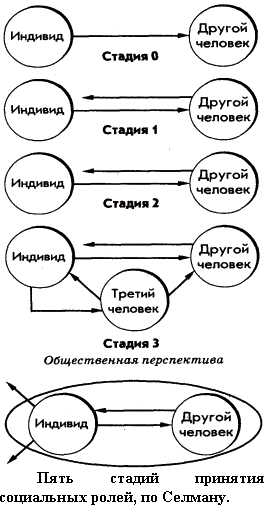 Одной из наиболее полезных моделей социального познания является модель Роберта Селмана (Selman, 1977,1980), который разработал теорию принятия социалъной роли (рис. 2.2). Под принятием социальной роли Селман понимал развитие способности относиться к себе и другим как к субъектам, реагировать нa действия окружающих так же, как на свои собственные, и рассматривать свое поведение с точки зрения других людей. Селман выделял следующие пять стадий развития: