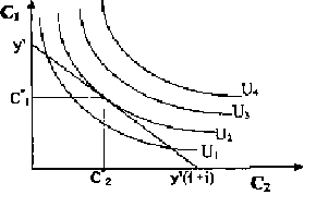 Кривые безразличия U>1>, ...U>4 >отражают меру предпочтения субъекта сегодняшнего потребления будущему при различных уровнях дохода (то есть они выражают все приемлемые для субъекта комбинации С>1> и С>4>).