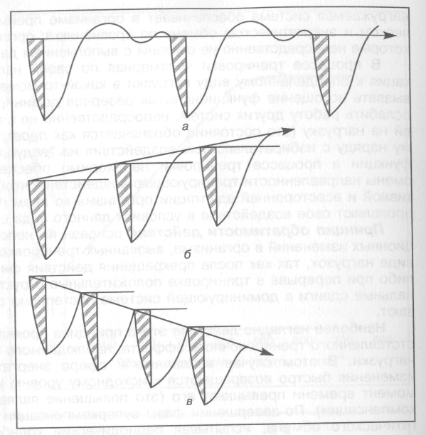 При короткочасних інтервалах між повторними навантаженнями, недостатніми для виникнення суперкомпенсації, як і при занадто тривалих інтервалах, при яких викликані навантаженням зрушення встигають повернутися до норми, не може бути досягнуте прогресуюче збільшення адаптаційних змін в організмі. Слід зазначити, що повною мірою правило повторного навантаження у фазу суперкомпенсації застосовно тільки до більших циклів тренування - тижневим або навіть місячним. У межах окремих тренувальних занять і мікроциклів тренування це правило дотримувати необов'язково. У даних тимчасових рамках головне завдання тренування зводиться до того, щоб повніше завантажити провідну функцію й цим стимулювати подальше розгортання адаптаційних процесів в організмі з відставленим досягненням більше вираженої фази суперкомпенсації. Тому на окремих тренувальних заняттях або в окремі мікроцикли тренування, де повторні навантаження задаються у фазу неповного відновлення, має місце прогресивне зниження показників побудови тренування.