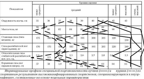 Выделенные на основе статистического и корреляционного анализов существенно значимые для достижения высокого спортивного результата показатели специальной подготовленности спортсменов, специализирующихся в пауэрлифтинге, послужили основанием для разработки модельных характеристик их соматического развития, функционального состояния организма и специальной силовой подготовленности.