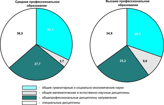 В контексте рассматриваемой проблемы определялась приоритетность учебных дисциплин. Анализ производился без учета профессиональной практики. Установлено, что соотношение количества часов по блокам учебных дисциплин в системе "колледж-вуз" (см. рисунок) имеет одинаковую направленность распределения в различных по уровню образовательных учреждениях. Так, наибольшее количество часов в учебных планах СПО и ВПО отмечается по блоку специальных дисциплин (соответственно 36,5 и 34,9%). На второй позиции стоит блок общих гуманитарных и социально-экономических наук (32,1 и 30,3%), на третьей - общепрофессиональных дисциплин направления (27,7 и 25,2%) и на четвертой - общих математических и естественно-научных дисциплин (3,7 и 9,6 %).