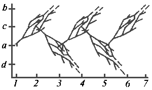 срединная часть первой метелки – с2; здесь отмечается наибольшее количество ветвлений, что означает развитость, "расцвет" отображаемой системы, вместе с тем где-то здесь же – в срединной части "цветущей" метелки берет начало, зарождается следующая метелка, расположенная по отношению к первой примерно ортогонально, это означает, что ход развития, отображаемый этой (второй) метелкой, имеет по отношению к предыдущему (в котором он пусть и возник) много признаков отличия, независимости и, возможно, противостояния. Аналогичным образом дело обстоит и в отношении последующих пяти элементов предлагаемой схемы. Метелку в целом можно обозначить, указав ее начало и конец. Так, первая слева может быть обозначена а1-b3, вторая – с2-d4 и т. д.