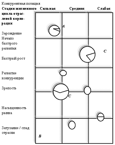 Данная матрица распределяет различные хозяйственные подразделения диверсифицированной отраслевой корпорации по стадиям жизненного цикла отрасли. Иногда исходные данные матрицы можно представить в виде круга, где площадь кругов представляют размер отраслевой корпорации, а сектор внутри круга - долю рынка конкурентного бизнеса. На рис. 15 показан один из вариантов такого круга в котором А - обозначена как развивающаяся отраслевая корпорация, В - как проигравшая корпорация, C - сегодняшний победитель.