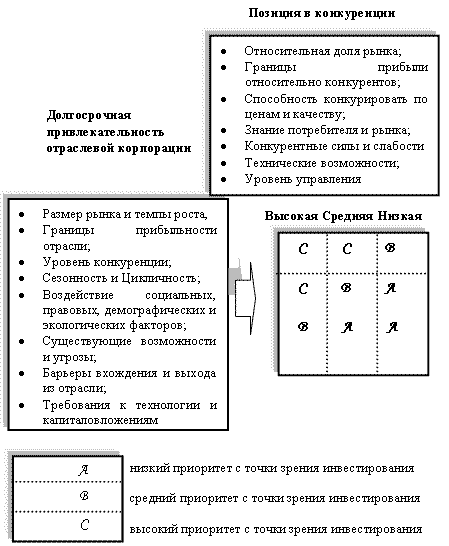 Данная матрица разработана для анализа собственного диверсифицированного портфеля отраслевой корпорации, рассматривающая положение каждого ее структурного подразделения на основе количественных оценок долгосрочной привлекательности отраслевой корпорации, а также позиции подразделений в ней.