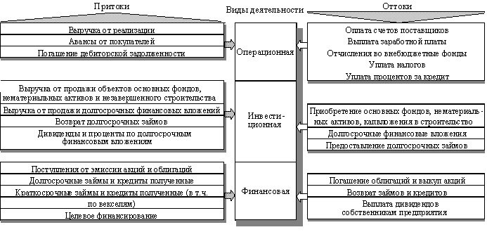 Несмотря на различия в технике составления, отчет о денежных потоках, независимо от применяемого метода, должен отражать поступление и выбытие денег в разрезе основных видов деятельности – операционной, инвестиционной и финансовой. Принципы отнесения отдельных денежных потоков к конкретным видам деятельности изложены в § 1.2. Схематично состав и структура денежных потоков представлена на рис. 1.4.1.