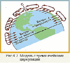 Если бы Земля была полностью покрыта водой, то модель с тремя циркуляционными ячейками была бы более близка реальному положению дел. Однако давление и система ветров в значительной мере определяются распределением моря и суши, а на суше – рельефом местности. Здесь работают тепловые машины второго рода. В холодное время года нагревателем в них служат наиболее теплые области океана, а холодильником - материки. В теплое время года ситуация меняется, материк быстро нагревается, по сравнению с океаном, и служит нагревателем, а океан - холодильником. Исключение составляют лишь Антарктида и Гренландия, которые из-за мощного материкового оледенения круглый год выполняют функции холодильника. Например, в январе над Азией и Северной Америкой появляется область высокого давления, в то время как над океаном давление понижено. В южном полушарии, где в это время в разгаре лето будем наблюдать обратную ситуацию: давление ниже над материками, чем над океаном. Работа машин второго рода в значительной мере определяет муссонную циркуляцию. Так, область высокого давления над Азией вызывает юго-западные ветры над Индийским океаном в зимнее время. Этот поток сухого воздуха вызывает сильное испарение над сушей и смежным океаном. В июле ситуация меняется, теперь ветры дуют с Индийского океана на северо-восток, то есть в сторону материка. Влажный океанический воздух, достигая теплого материка, приносит с собой обильные осадки, которые называются муссонными дождями.