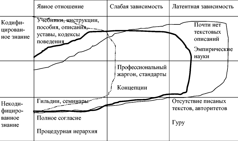 Выделим в связи с этим одно парадоксальное свойство, проявляющее себя в логике развития обществ, основанных на знании: чем выше уровень организованности общества, тем меньше его способность к изменениям, вы рожающаяся в способности накапливать и распространять неявное знание.