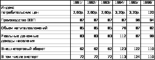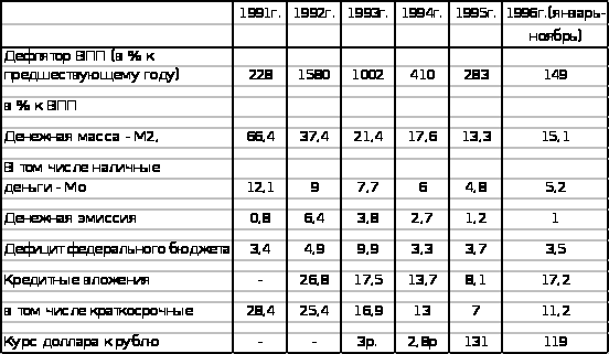 Всплеск инфляции в 1992г. трудно подтвердить цифрами по всем содержащимся в таблице показателям, так как некоторые из них ранее не исчислялись либо их уровень был предопределен преобладанием нерыночной экономической обстановки. Зато довольно отчетливо просматривается замедление роста дефлятора ВВП и влияние на снижение уровня инфляции применения всех