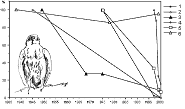 За 100 % взят наивысший уровень из известных для каждой популяции. Использованы данные: Болгария - Baumgart, 1977; Data of the Birds of Prey Protection Society of Bulgaria, 2002; Австрия - Bauer, 1977; Словакия - Hudec, Иernэ, 1977; Slбdek, 1977; Поволжье - Galushin et al., 2001; Казахстан - Levin, 2001; Наурзумский заповедник (Казахстан) - Bragin, 2001.