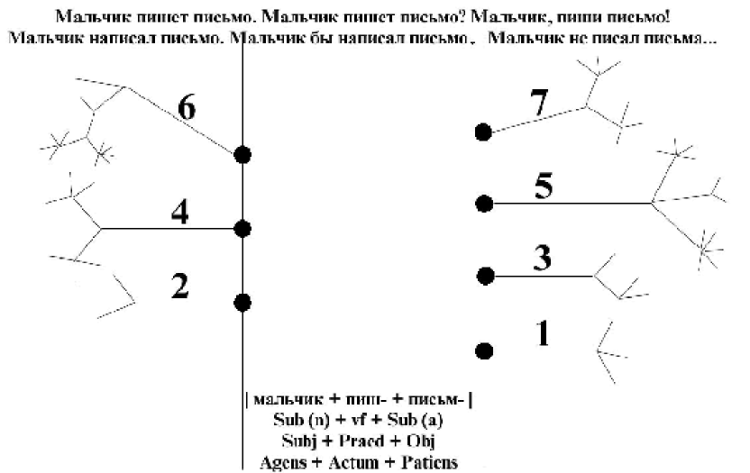 Условные обозначения в схеме: 1 — терминалы категории коммуникативного намерения (утверждение, вопрос, побуждение); 2 — терминалы положительного / отрицательного высказывания; 3 — терминалы диатезы (актив — пассив с разведением на процессуальный и статальный);