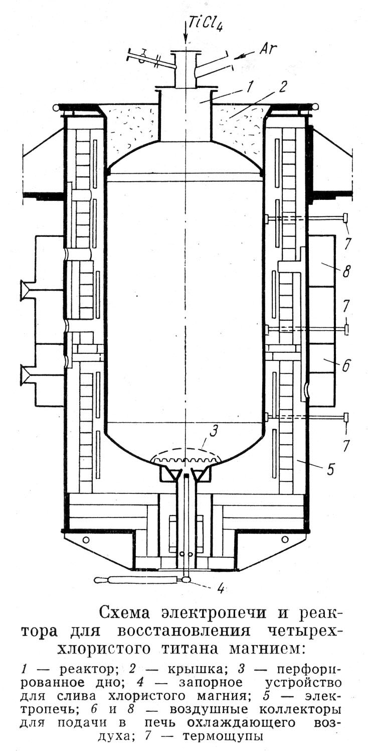 Объемные соотношения титана, магния и хлористого магния в реакторе таковы, что на каждую единицу объема, занимаемого титаном, приходится 2,8 единиц объема магния и 10,4 единицы объема образующегося хлорида магния. Поэтому для более полного использования рабочего объема реактора, хлористый магний в процессе восстановления периодически сливают из реактора.