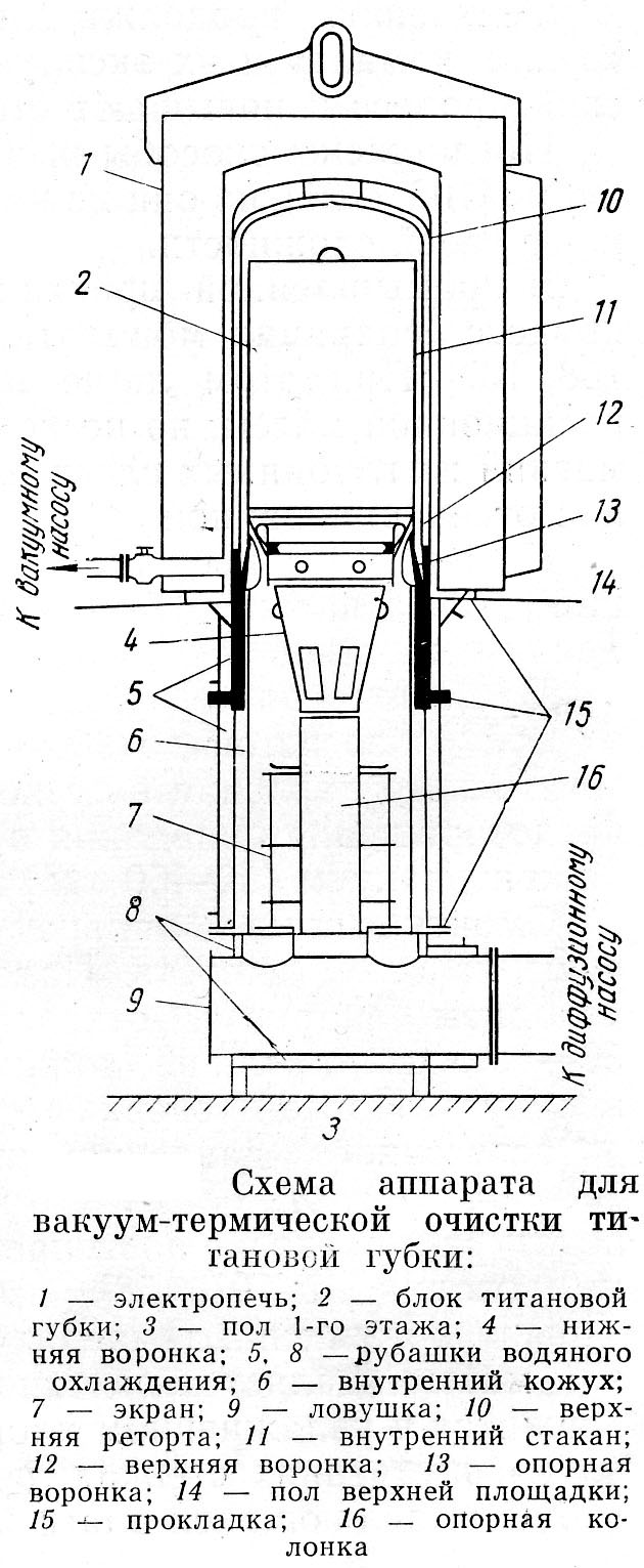 За один цикл аппарат вакуум-термической очистки титановой губки также перерабатывает 2000кг. Учитывая, что его производительность (30 часов) лишь несколько меньше производительности реактора (39 часов), в цеху необходимо использовать 13 таких аппаратов (по одному аппарату-дистиллятору на каждый реактор восстановления).