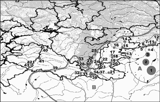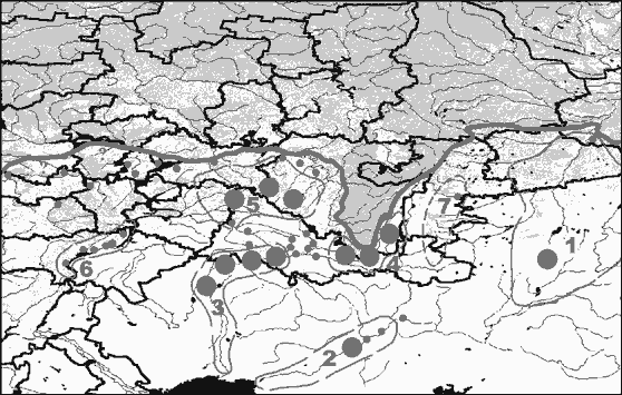 Популяции: 1 - Тоболо-Ишимская, 2 - Эмбинская, 3 - Уральская, 4 - Южноуральская, 5 - Заволжская, 6 - Предволжская, 7 - возможная Урало-Тобольская.