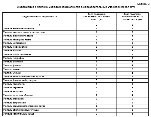 Практика показывает, что выпускники этих учебных заведений, как правило, отличаются энциклопедическим объемом знаний по избранной специальности и умением применять их в различных сферах деятельности. И эти два фактора зачастую являются решающими при подборе специалистов на работу. Например, 68 % педагогов в Воронежской области закончили высшие учебные заведения. Из них 67 % закончили университеты (ВГУ; ВГПУ) и 18 % - ВГУ (табл. 1). Четырнадцать процентов специалистов, работающих в школах области, выпускает Борисоглебский государственный педагогический институт. На общем фоне - это небольшой процент, но необходимо учесть, что 50 % учителей начальных классов и пятая часть учителей русского языка и литературы - выпускники БГПИ.