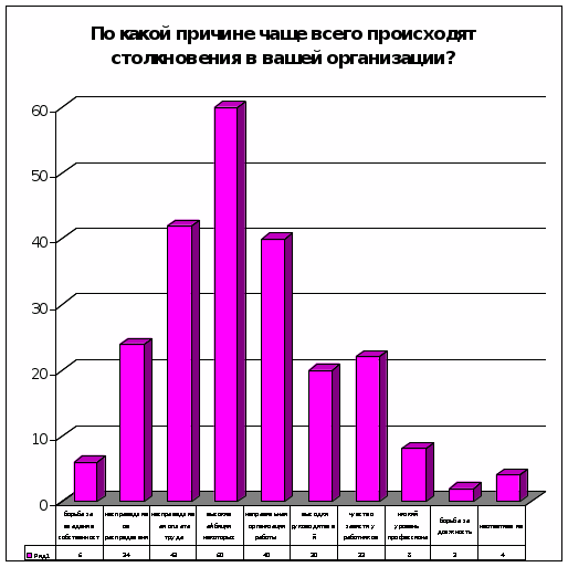 4. Неудовлетворенность отношениями между отдельными структурными единицами организации, т.е. тем местом или статусом, которые работники или социальные группы занимают в структуре организации. Этот тип причин вызывает структурные конфликты. Конкретными причинами таких конфликтов могут или отдельных работников занять более высокое место в статусной иерархии и получить большее количество ресурсов в условиях, когда методы простой конкуренции недостаточно эффективны для достижения этой цели;