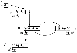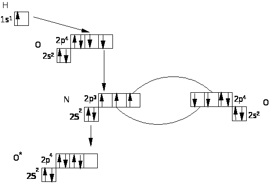 Рассмотрим строение азотной кислоты с позиции метода валентных связей. Для этого посмотрим, какие орбитали принимают участие в образовании молекулы этой кислоты.