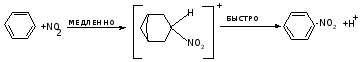Важность ионизации первого типа подтверждается тем, что добавление ионизированных нитратов к реакционной смеси замедляет реакцию. Процесс нитрования можно представить в виде: