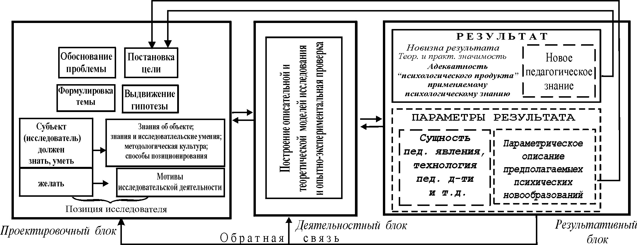 При обосновании проблемы выявляются типичные затруднения, возникающие в педагогической деятельности. Эти затруднения представляются в виде следующих психологических характеристик: действия субъектов; эффект, который получается в результате совершения субъектами действий. При формулировке темы исследования обозначается ведущее личностное качество, отражающее целевые характеристики разрабатываемого проекта педагогической деятельности. При постановке цели исследователь фиксирует параметры предполагаемого психического новообразования, которое может явиться результатом реализации разрабатываемой им модели педагогической деятельности. При выдвижении гипотезы фиксируются особенности авторской модели педагогической деятельности. Исследователь указывает, на развитие каких личностных качеств или характеристик деятельности субъекта ориентирована выстраиваемая им модель, а также описывает психологический механизм, лежащий в ее основе.