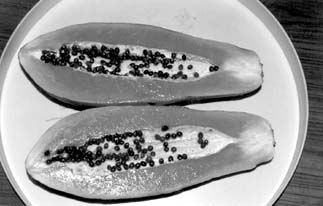 Плоды папайи округлой или овальной формы и имеют от 20 до 35 см в длину. Они висят на стволе под пучком листьев, словно огромная гроздь винограда. При созревании становятся оранжевыми. По структуре плод папайи похож на дыню: кожура, под ней сочная мякоть, а внутри небольшая полость с темными шариками-семенами. Может быть, именно поэтому папайю прозвали дынным деревом. На сегодняшний день известно множество сортов этого растения, отличающихся внешним видом, величиной плодов и, конечно же, вкусовыми качествами.