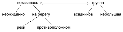 Главные члены предложения – подлежащее и сказуемое составляют как бы “костяк”, основу любого предложения. Второстепенные члены предложения группируются либо вокруг подлежащего, либо вокруг сказуемого, детализируют информацию, передаваемую главными членами предложения. Чтобы сказуемое было понятнее, представим в виде схемы предложение “На противоположном берегу реки неожиданно показалась небольшая группа всадников.”