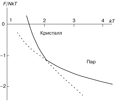 Рис. 1. - Температурная зависимость свободной энергии F при фазовом переходе первого рода "пар-кристалл". |