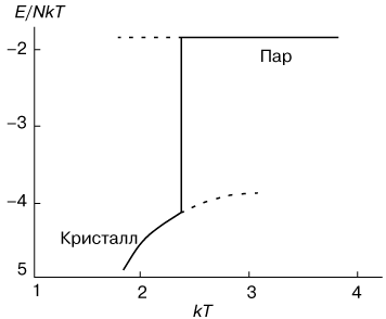 Рис. 2. - Изменение энергии E в зависимости от температуры T при фазовом переходе первого рода "пар-кристалл". |