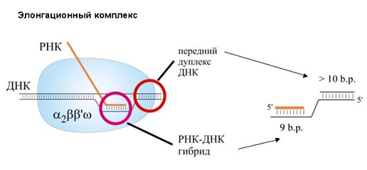 РНК наращивается на 3΄-конце. Присоединением каждого нуклеотида кор-фермент делает шаг по ДНК и сдвигается на один нуклеотид. Так как все в мире относительно, то можно сказать, что кор-фермент неподвижен, а сквозь него «протаскивается» ДНК. Понятно, что результат будет таким же. Но мы будем говорить о движении по молекуле ДНК. Размер белкового комплекса, составляющего кор-фермент, 150 Ǻ. Размеры РНК-полимеразы - 150×115×110Ǻ. То есть это такая наномашина. Скорость работы РНК-полимеразы – до 50 нуклеотидов в секунду. Комплекс кор-фермента с ДНК и РНК называется элонгационным комплексом. В нем находится ДНК-РНК гибрид. То есть это участок, на котором ДНК спарена с РНК, и 3΄-конец РНК открыт для дальнейшего роста. Размер этого гибрида – 9 пар оснований. Расплетенный участок ДНК занимает примерно 12 пар оснований.