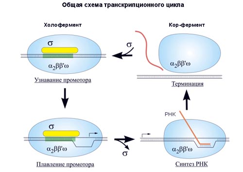 Связавшись с ДНК, а именно с промотором, который распознала σ-субъединица, холофермент расплетает двунитевую спираль и начинает синтез РНК. Участок расплетенной ДНК – это точка инициации транскрипции, первый нуклеотид, к которому должен комплементарно быть присоединен рибонуклеотид. Инициируется транскрипция, σ-субъединица уходит, а кор-фермент продолжает элонгацию цепи РНК. Затем происходит терминация, кор-фермент освобождается и становится готов к новому циклу синтеза.