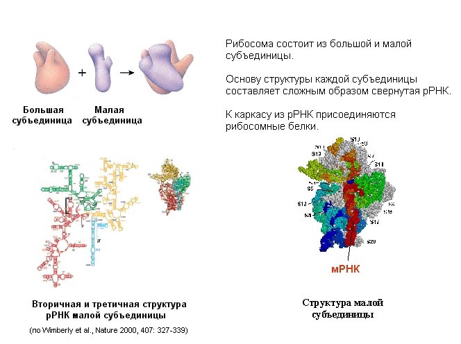 Белки в рибосоме держатся на каркасе, состоящем из рибосомной РНК. Формирование рибосомы начинается с того, что рибосомная РНК сворачивается и на нее в определенном порядке начинают налипать белки. На рисунке представлена рибосомная РНК. В ней самокомплементарные участки нити РНК спариваются, образуя шпильки (вторичная структура), и затем РНК сворачивается (третичная структура РНК), образуя каркас субчастиц.