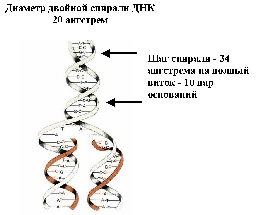 Здесь также указан один из параметров ДНК, это шаг спирали, на каждый полный виток приходится 10 пар оснований, заметим, что один шаг – это не между ближайшими выступами, а через один, так как у ДНК есть малая бороздка и большая. Через большую бороздку с ДНК взаимодействуют белки, которые распознают последовательность нуклеотидов. Шаг спирали равен 34 ангстрем, а диаметр двойной спирали – 20 ангстрем.