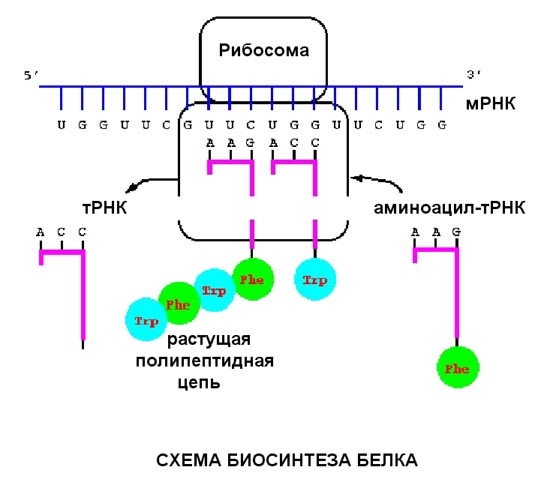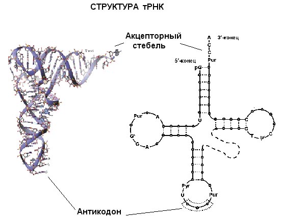 Еще один вид РНК, участвующей в синтезе белка, это транспортная РНК (тРНК). Молекулы тРНК относительно небольшие (по сравнению с рибосомногй или матричной РНК). Все тРНК имеют общую вторичную структуру. За счет спаривания комплементарных участков молекулы тРНК образуется три "стебля" с петлями на концах и один "стебель", образованный 5'- и 3'-концами молекулы тРНК (иногда образуется еще дополнительная пятая петля). Изображение этой структуры похоже на крест или клеверный лист. "Голова" на этом листе представлена антикодонной петлей, здесь находится антикодо – те три нуклеотида, которые комплементарно взаимодействуют с кодоном в мРНК. Противоположный антикодонной петле стебель, образованный концами молекулы, называется акцепторным стеблем – сюда присоединяется соответствующая аминокислота. Распознают подходящие друг другу тРНК и аминокислоты специальные ферменты, называемые аминоацил-тРНК синтетазами. Для каждой аминокислоты есть своя аминоацил-тРНК синтетаза.